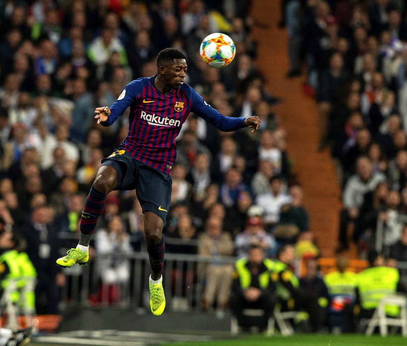 epa07402406 FC Barcelona's Ousmane Dembele (R) in action during the Spain's King Cup second leg semifinal match between Real Madrid and FC Barcelona at Santiago Bernabeu stadium, in Madrid, Spain, 27 February 2019. EPA-EFE/Rodrigo Jimenez