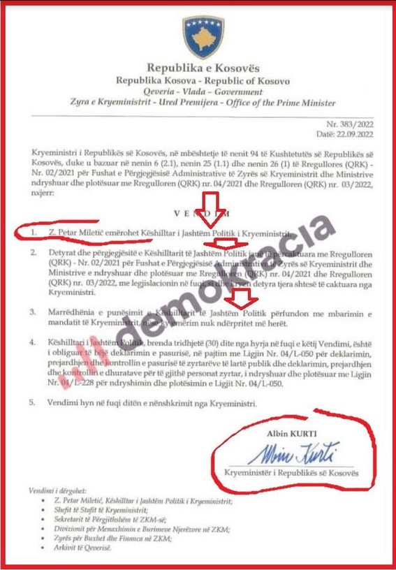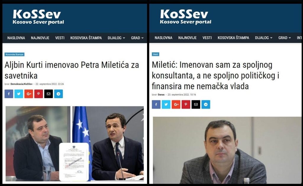 Fašista Kurti je juče 22.9.2022. u dogovoru sa Nemačkom, imenovao za svog spoljno-političkog savetnika, Petra Miletića. U jednoj od tačaka Kurtijeve odluke navodi se da Miletiću u svojstvu spoljnopolitičkog savetnika prestaje radni odnos prestankom mandata premijera, ako imenovanje ne prestane ranije. Miletić je rođen 1975. u Peći. Miletić je novinar i u politiku je ušao 2006., kao osnivač Samostalne liberalne stranke, koja nikada nije uživala podršku Srba sa KiM. Miletić je SLS osnovao zajedno sa svojim šurakom Slobodanom Petrovićem, kome je kasnije i prepustio vođenje te beznačajne stranke. Miletić je 2008. godine bio viši politički savetnik u Ministarstvu za zajednice i povratak i poslanik u Skupštini Kosova u dva mandata (2009-2014). Bio je šef poslaničke grupe SLS (2009-2011), potpredsednik Skupštine Kosova (2011-2014) i predsedavajući Konsultativnog veća za zajednice u kabinetu predsednika Kosova (2010-2013). Potom je 2018. Miletić postao član Pokreta slobodnih građana, i zamenik predsednika PSG, Sergeja Trifunovića. Posle debakla PSG na izborima 2020. Miletić je podneo ostavku, ali je tada naglasio da ostaje član PSG (Blic 20.08.2020.). Miletić samo povremeno boravi na KiM, a u stvari živi u Beogradu, što je postalo jasno kada je bio zamenik Sergeja Trifunovića. Miletić je i dan danas član PSG, i sada je kao član PSG, postao Kurtijev spoljno-politički savetnik!?! Već ovo ukazuje na potpunu političku konfuziju samog Petra Miletića. Da konfuzija bude veća pobrinuo se sam Miletić, koji je posle svog imenovanja za Kurtijevog savetnika, slagao da nije spoljno-politički savetnik, već „spoljni konsultant“. Miletić je priznao da je, citiram: „finansiran od strane Vlade Nemačke, preciznije ministarstva spoljnih poslova Nemačke za pitanja zajednica“. To je Miletić rekao u pisanoj izjavi za list „Danas“. Miletića demantuje Kurtijeva odluka, u kojoj se navodi da Miletiću u svojstvu spoljnopolitičkog savetnika prestaje radni odnos prestankom mandata premijera.