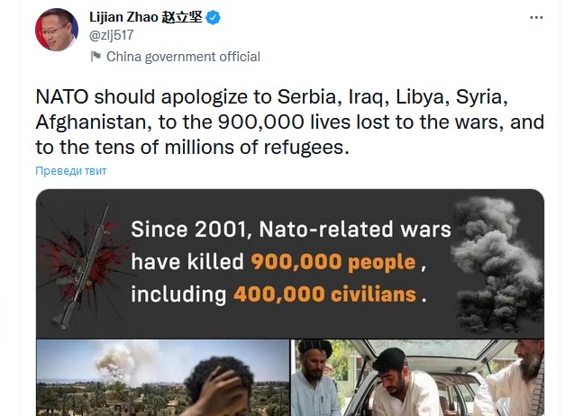https://twitter.com/zlj517/status/1549028725110771713?ref_src=twsrc%5Etfw%7Ctwcamp%5Etweetembed%7Ctwterm%5E1549028725110771713%7Ctwgr%5E%7Ctwcon%5Es1_&ref_url=http%3A%2F%2Fwww.nspm.rs%2Fhronika%2Fpotparol-ministarstva-spoljnih-poslova-kine-dzao-lidjijan-nato-da-se-izvini-srbiji-iraku-libiji-siriji-i-avganistanu-zbog-900.000-izgubljenih-zivota-i-desetina-miliona-izbeglica.html%3Falphabet%3Dl