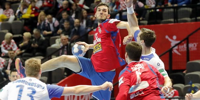 epa06444170 Petar Nenadic (C) of Serbia in action during the EHF European Men's Handball Championship 2018 group A match between Iceland and Serbia in Split, Croatia, 16 January 2018. EPA-EFE/ANTONIO BAT